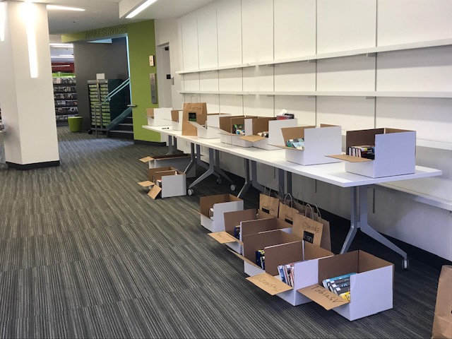 What is a very simple process for you actually requires a lot of steps from our team inside the building. Material Services receives your requests, and they go about the building gathering your items. Another team brings them in the back and makes tags with your name so they can be shelved and easy to find. Larger requests are boxed ahead of time.