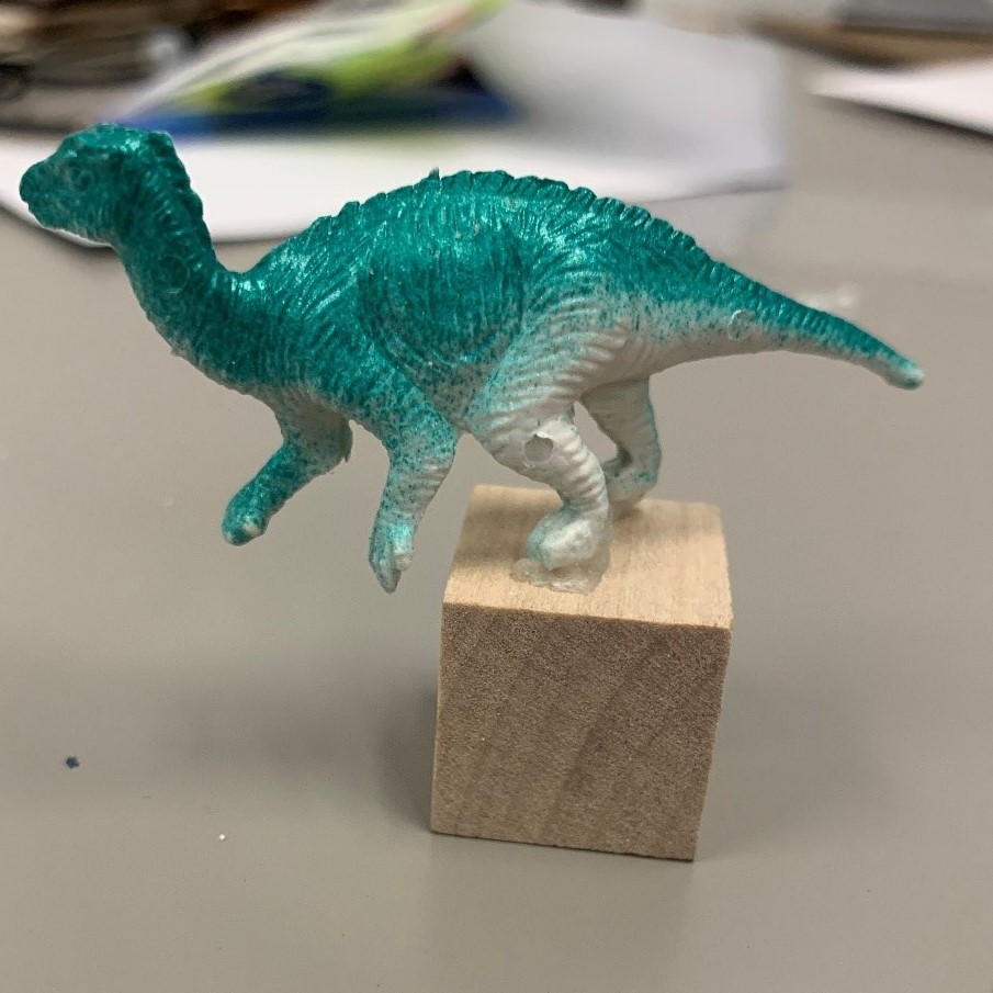 8. Add the rubber ducky, dinosaurs, spoon, and cup to the bin.