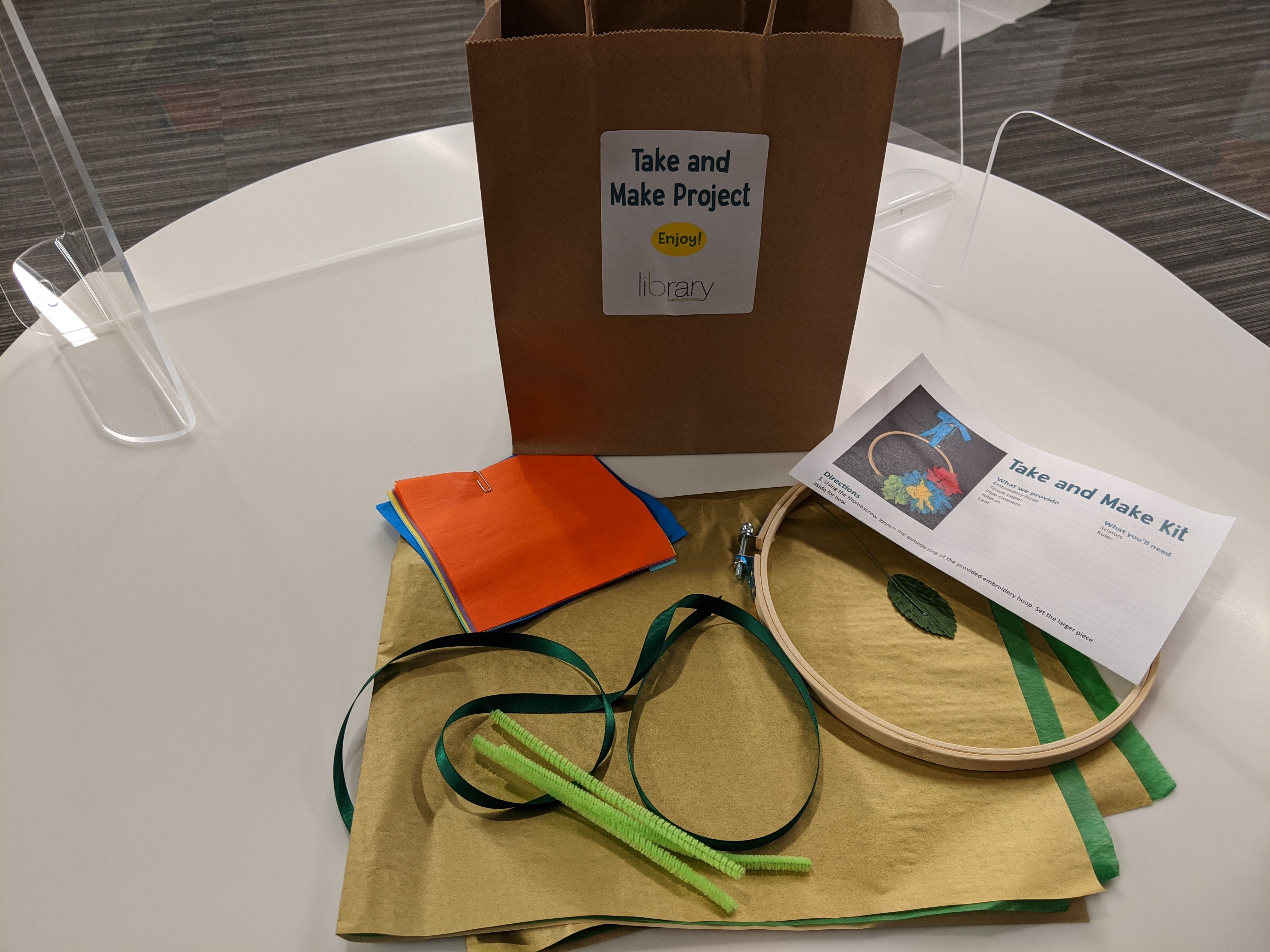 To pick up your Take and Make Project, just ask one of our friendly staff members to grab one for you. Kits are available while supplies last and are first come, first serve. They're also available via Parking Lot Pick-Up, so long as you ask for one when you pull up to pick up your books. Want to make it a family craft night? That's great! Ask for as many as you need. We hope you enjoy crafting with us from afar!